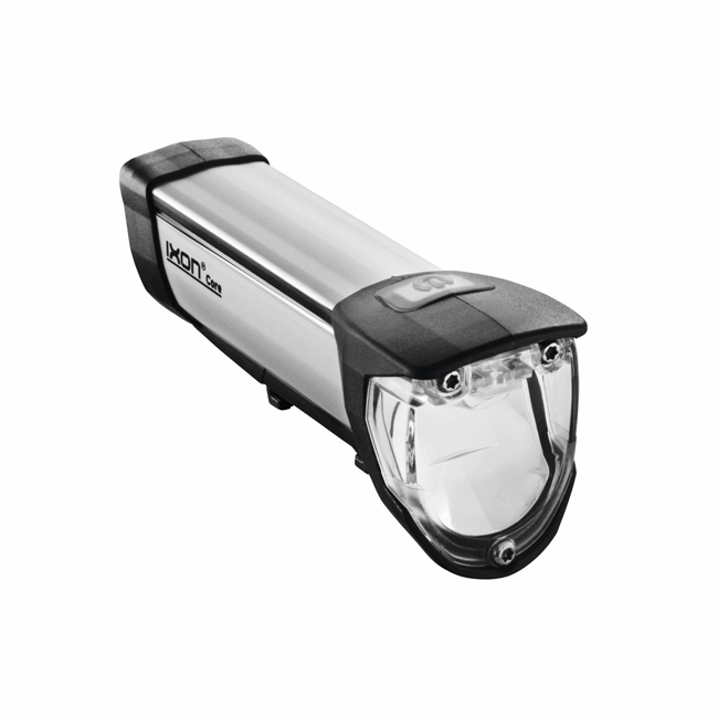 Ixon Core, der LED-Scheinwerfer mit IQ2-Technologie, silbernem Aluminiumgehaeuse mit umlaufender Weichkomponente fuer Stossschutz. Aufladbar per Micro-USB-Buchse, Netzteil und Kabel beiliegend. Wiegt inklusive Akku und Halterung nur 112 g.