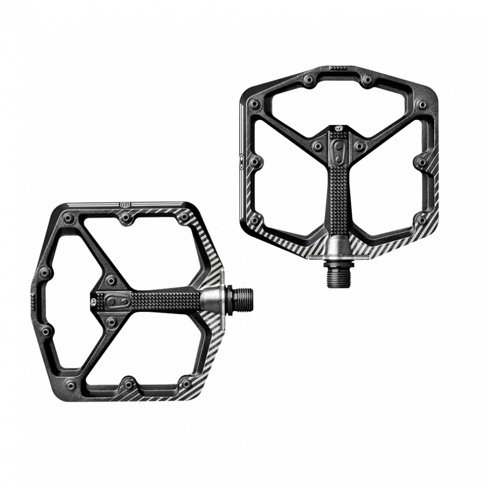 Das neue Downhill und Freeride Plattform Pedal, Crank BrothersStamp. Zwei unterschiedliche Groessen sorgen fuer eine optimale Verbindung zwischen Schuh und Pedal. Die Stamp Pedale bieten geringes Gewicht durch minimale Hoehe 15-13-15 mm, die konkave Pedalfrom krallt sich foermlich in die Schuhsohle. Die premium igus LL-glide Lager sorgen von weichen Lauf und hohe Haltbarkeit. Das offene Design spart Gewicht und beguenstigt die Selbstreinigung bei schlammigen Bedingungen. Bester Grip wird durch 10 Pins Pro Pedalseite gewaerleistet und zusaetzlich durch das Waffelmuster im Zentrum unterstuetzt.