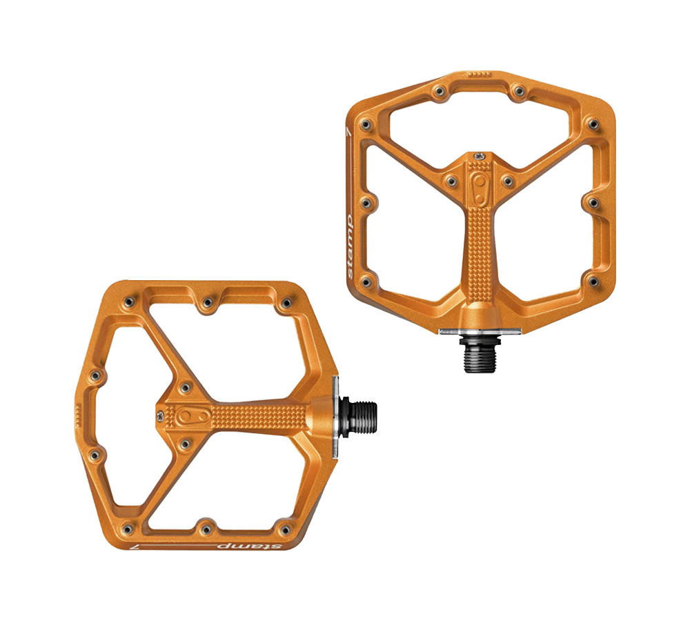Das neue Downhill und Freeride Plattform Pedal, Crank BrothersStamp. Zwei unterschiedliche Groessen sorgen fuer eine optimale Verbindung zwischen Schuh und Pedal. Die Stamp Pedale bieten geringes Gewicht durch minimale Hoehe 15-13-15 mm, die konkave Pedalfrom krallt sich foermlich in die Schuhsohle. Die premium igus LL-glide Lager sorgen von weichen Lauf und hohe Haltbarkeit. Das offene Design spart Gewicht und beguenstigt die Selbstreinigung bei schlammigen Bedingungen. Bester Grip wird durch 10 Pins Pro Pedalseite gewaerleistet und zusaetzlich durch das Waffelmuster im Zentrum unterstuetzt.