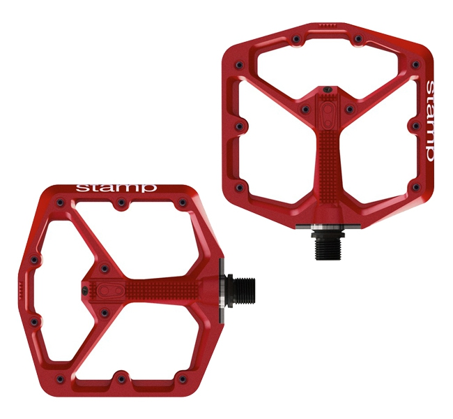 Das neue Downhill und Freeride Plattform Pedal, Crank BrothersStamp. Zwei unterschiedliche Groessen sorgen fuer eine optimale Verbindung zwischen Schuh und Pedal. Die Stamp Pedale bieten geringes Gewicht durch minimale Hoehe 15-13-15 mm, die konkave Pedalfrom krallt sich foermlich in die Schuhsohle. Die premium igus LL-glide Lager sorgen von weichen Lauf und hohe Haltbarkeit. Das offene Design spart Gewicht und beguenstigt die Selbstreinigung bei schlammigen Bedingungen. Bester Grip wird durch 10 Pins Pro Pedalseite gewaerleistet und zusaetzlich durch das Waffelmuster im Zentrum unterstuetzt.