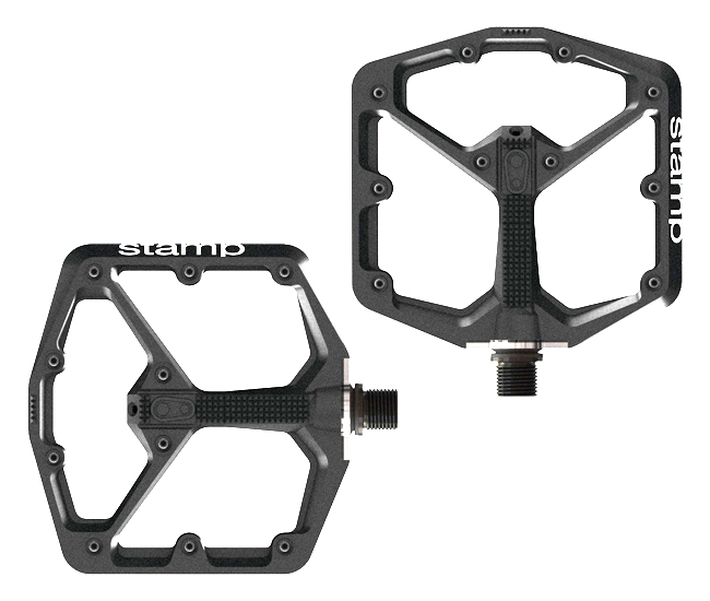 Das neue Downhill und Freeride Plattform Pedal, Crank BrothersStamp. Zwei unterschiedliche Groessen sorgen fuer eine optimale Verbindung zwischen Schuh und Pedal. Die Stamp Pedale bieten geringes Gewicht durch minimale Hoehe 15-13-15 mm, die konkave Pedalfrom krallt sich foermlich in die Schuhsohle. Die premium igus LL-glide Lager sorgen von weichen Lauf und hohe Haltbarkeit. Das offene Design spart Gewicht und beguenstigt die Selbstreinigung bei schlammigen Bedingungen. Bester Grip wird durch 10 Pins Pro Pedalseite gewaerleistet und zusaetzlich durch das Waffelmuster im Zentrum unterstuetzt.