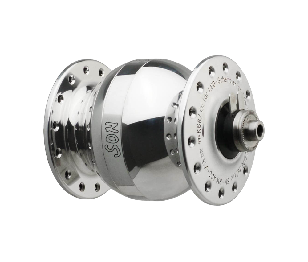 Der SonDelux Nabendynamo Wide body bietet exellenten Leichtlauf, hohen Wirkungsgrad und ist die ideale Ergaenzung zu den Schmidts Edelux Lampen, da der SonDelux besonders verlustarm ist und trotzdem bei geringer Geschwindigkeit viel Licht macht.